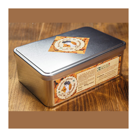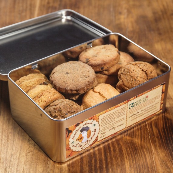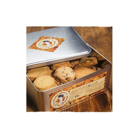 Boite en métal petit modèle, composée d'un assortiment de 19 biscuits faits main et préparés uniquement avec des produits naturels biologiques,...