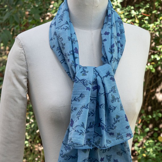 Chèche en voile de coton imprimé de petits fleurs de violette Isatis.