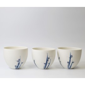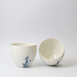 Création originale faisant partie de la collection Blanc-Bleu qui est zen et aérienne. L'intérieur est nappé d'une couverte transparente. L'extérieur laissé brut est décoré de fin végétaux. Ce décor est réalisé au pinceau, à main levée.