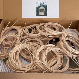 Dans une jolie boîte en carton, sont fournis tous les matériaux nécessaires pour fabriquer cet objet en rotin.